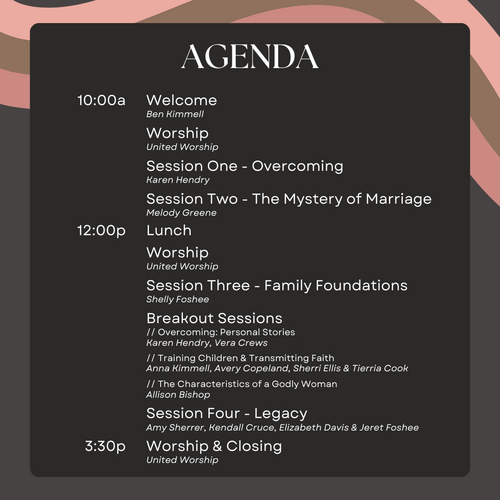 Rooted in Ecclesiastes 3:1, "To everything there is a season, and a time to every purpose under the heaven," this gathering is designed to encourage women to walk faithfully in every season of life. Through worship, large-group sessions, and breakout discussions, we’ll explore how to deepen our faith, strengthen our families, and leave a lasting legacy for God’s glory.
